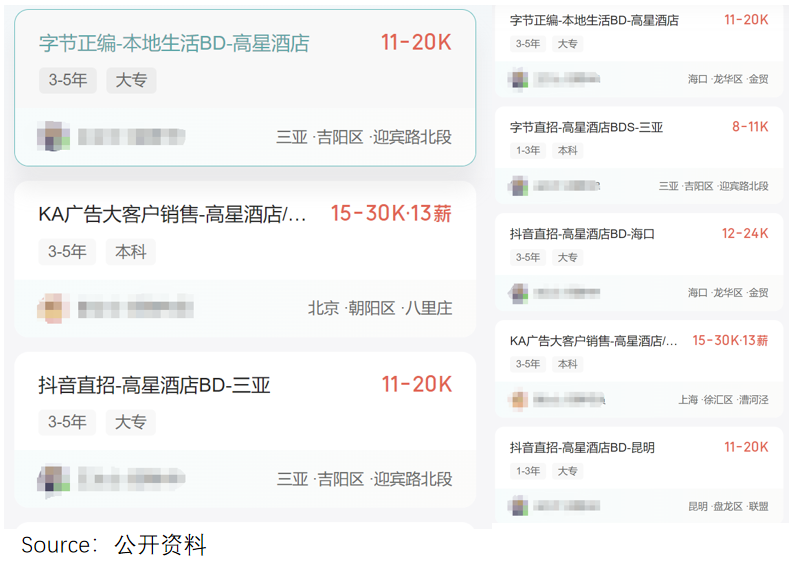 除了少收佣金,在高喊“去肥增瘦”的当下,抖音也放出了不少高星酒店BD的招聘需求。