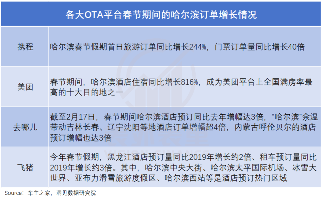 可以看到,今年春节期间,携程哈尔滨旅游首日增速为244%;其他平台哈尔滨订单同比增幅,也都超2倍。