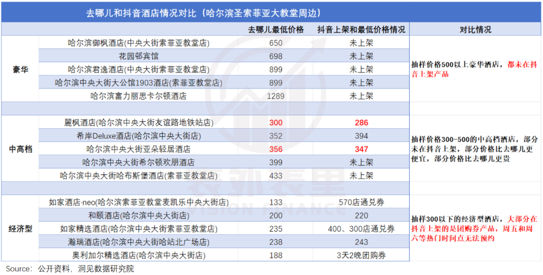圣索菲亚大教堂周边的随机抽样显示,500以上豪华酒店,全部没在抖音上架产品;300-500的中高档,也有很多没上架抖音;300以下经济型,在抖音上架的大多是团购券产品,周五和周六等热门时间点无法预约。
