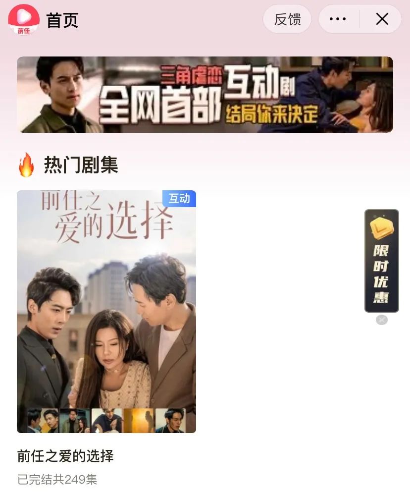 自去年的精品化策略之后,抖音今年继续加码短剧赛道的投入,而且是几条业务线“多点开花”。抖音集团旗下商业化部门的巨量引擎,在抖音内上线了“泡泡心选”的短剧小程序,目前平台内仅有一部短剧《前任之爱的选择》,该短剧采用互动玩法,在最后一集需要用户选择结局的走向,每种选择都对应着新的故事结局。该短剧需要付费观看,一个月的会员价格需为199元。
