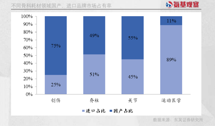 根据《中国医疗器械蓝皮书(2022)》,国产耗材在创伤领域的市场占有率已经达到75%。不过,在脊柱、关节和运动医学领域,国产品牌占比仍有待提升。