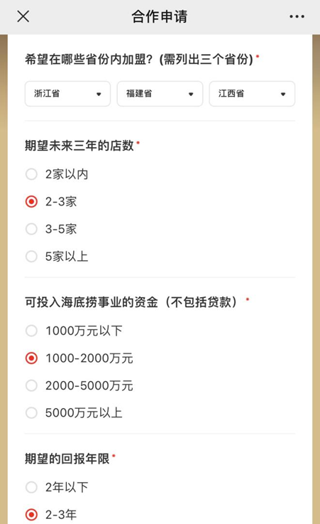 海底捞加盟申请表部分内容