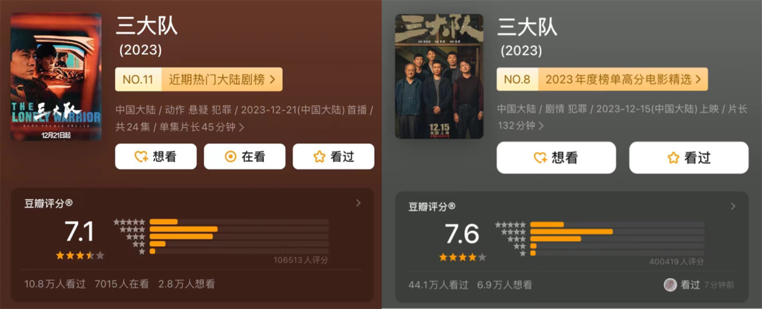 除了《唐探》和《飞驰人生》这两大IP,去年底上映的《三大队》也是“网影联动”的成功案例。电影《三大队》在上映期间,剧版爱奇艺站内热度近9000,影版票房近5亿,两者打配合,形成了不少的声量。但影版“提前剧透”让剧版的结局少了一分悬念,剧版的豆瓣评分也比影稍逊一筹。在这个网影联动的优秀案例中,依然发现了新的问题,《三大队》是由同公司、同IP开发,在内容品质上有所保证,不存在“卖情怀”“割韭菜”的现象,但观众容易以先出现的版本“先入为主”,哪怕剧版演员的知名度同样不低,也会让影迷觉得选角不够合适,剧情不够惊喜。