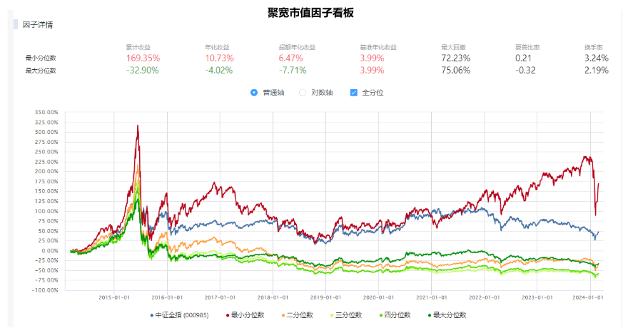 我们看蓝色的粗线,这是10%分位数市值线,虽然指数涨了4倍,但是10%分位数的市值基本没有变化,一直维持在20亿出头。也就是说,这个策略赚的是交易的钱,或者说流动性收益,并没有拉高市场整体的估值。