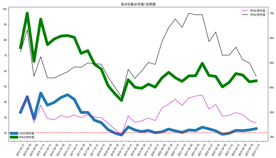 粗线是A股5%和10%分位数市值,对应着左边的竖轴刻度线,细线是90%和95%分位数市值,对应着右边的竖轴刻度线。