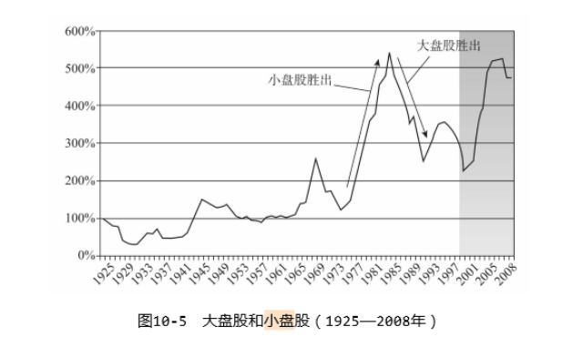 约翰·伯格将小盘股和大盘股的年度收益率的累计差值做一张图,就是上面这张。可以发现,从1925年到1964年的整整39年间,大盘股和小盘股年度收益率的累计差值一直在100%左右上下波动,显示双方的收益率基本没有什么差别,收益率真正拉开是1973年到1983年的这十年。如果没有这十年,小盘股和大盘股的收益率之间差别并不大。在整个将近100年的时间里,小盘股的复合年化收益率是12.7%,大盘股是11.0%,这造成了小盘股的最终价值是大盘的3倍,但是这么长的时间段和每年这么低的收益率差距,从统计学的角度,并不能说明双方收益率有大的差距。尤其从10年一个投资周期的角度出发,并不能说小盘股就一定会跑赢大盘股。