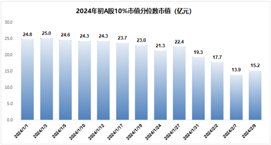 2024年开年,A股10%分位数下,市值是24.8亿,这个数据基本上可以认为是上市公司的壳价值。一个多月的时间,到了2月7日,这个数值变成13.9亿,近乎腰斩。