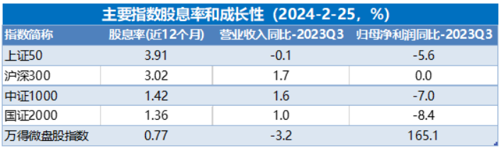 A股大盘股和小盘股最大的区别就是股息率,从最新的数据看,上证50股息率3.91%,最低的万德微盘股指数只有0.77%,成长性上拿出23年3季度的数据相差并不大。