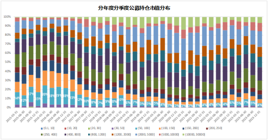 我们知道,从数量上看,A股大部分都是小盘股,100亿以上市值的公司只占到30%,剩下的70%都是小市值公司。从公募持仓的角度看,持有小盘股的比例微乎其微。