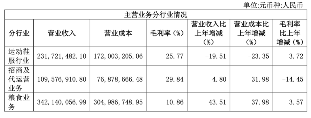 2023年半年报显示,运动鞋服和招商及代运营业务毛利率分别为25.77%和29.84%,贵人鸟粮食业务毛利率仅为10.86%,相比较而言,鞋服毛利更高。