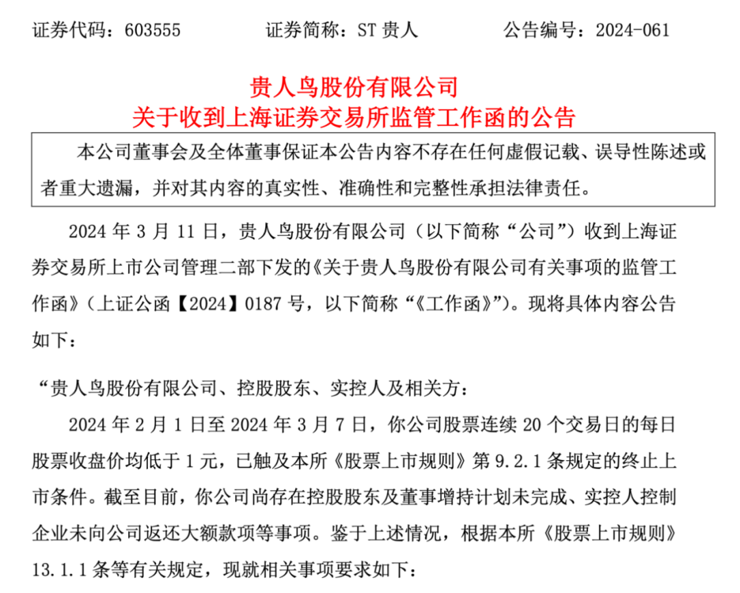 3月11日晚,贵人鸟发布公告称,2月1日至3月7日间,公司股票连续20个交易日的每日收盘价均低于1元,触及终止上市条件,上交所对公司股票作出终止上市决定。公司股票已经自3月8日开市起停牌。