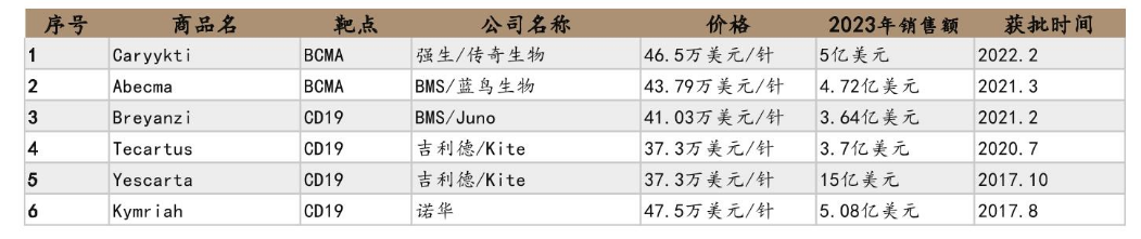 图:2023年全球CAR-T疗法销售情况,来源:德邦证券