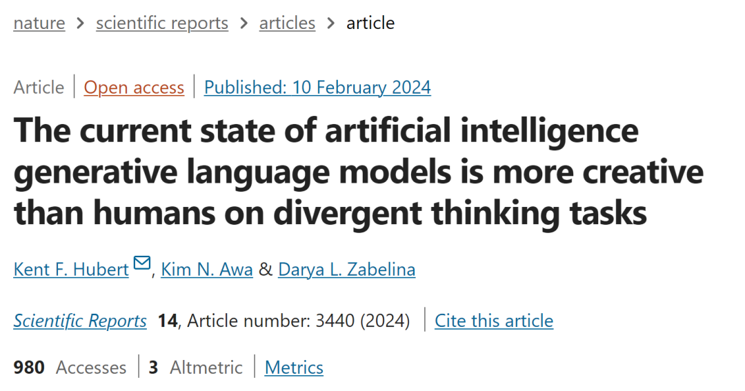 ▷论文:Hubert, Kent F., Kim N. Awa, and Darya L. Zabelina. "The current state of artificial intelligence generative language models is more creative than humans on divergent thinking tasks." Scientific Reports 14.1 (2024): 3440.