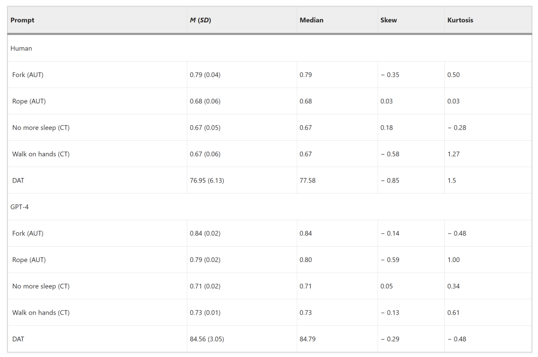 在发散性联想任务中,尽管人类在独特单词的数量上领先(人类独特单词数为651,占比87.03%,而GPT-4为220,占比69.40%),但GPT-4在语义距离得分上更高,分别为84.56(SD=3.05)和76.95(SD=6.13)。
