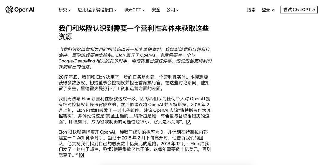 马斯克控告OpenAI的消息传出后,OpenAI官网上发布了一篇名为《OpenAI和埃隆·马斯克》的文章,除了表达团队仍在坚守使命和对马斯克的尊敬外,还透露了一个微妙的细节。