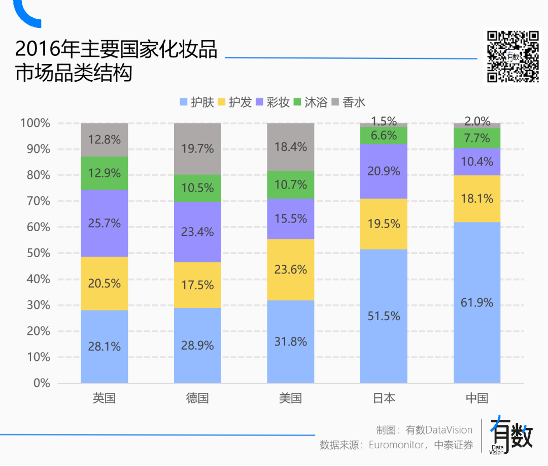 一方面,欧美和东亚的美妆护肤市场存在着较大的结构性差异。具体来说,在日本市场,美白是最核心的护肤诉求,而欧美消费者的肤质差异大,护肤诉求各异,香水和彩妆才是更稳定的诉求。
