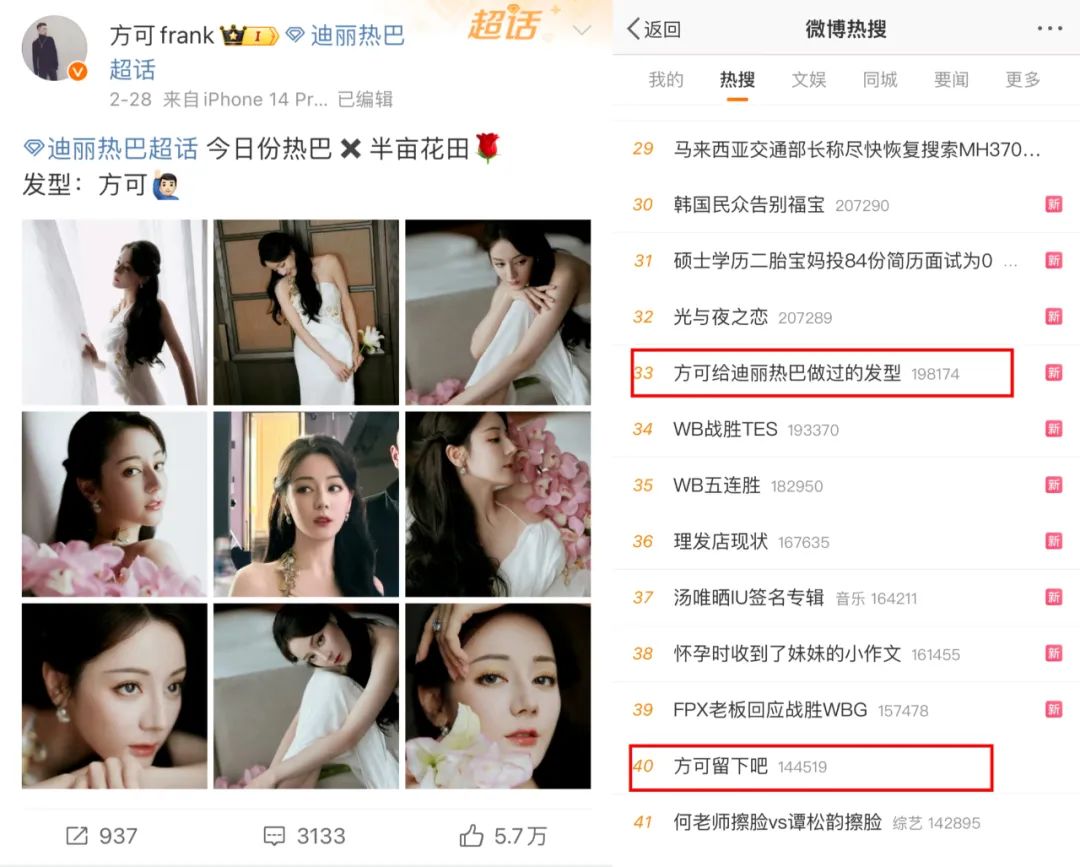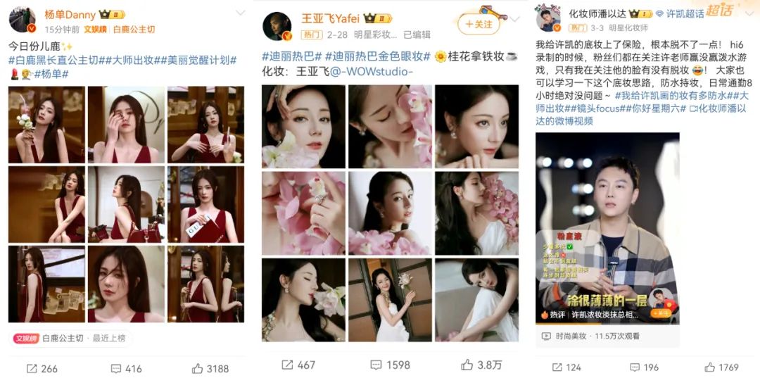 在明星相关妆容热搜下发布相关内容完成引流,对爆款妆容进行解析发布妆教内容,日常对品牌相关产品进行测评和好物分享,是明星化妆师在微博保持流量、沉淀粉丝的利器。典型例如王亚飞,一条针对迪丽热巴春晚舞台妆的解析获得7.2万点赞,在粉丝相关助推下,“迪丽热巴春晚舞台妆”解析登上热搜,让更多人关注到妆容设计思路和眼影技巧。
