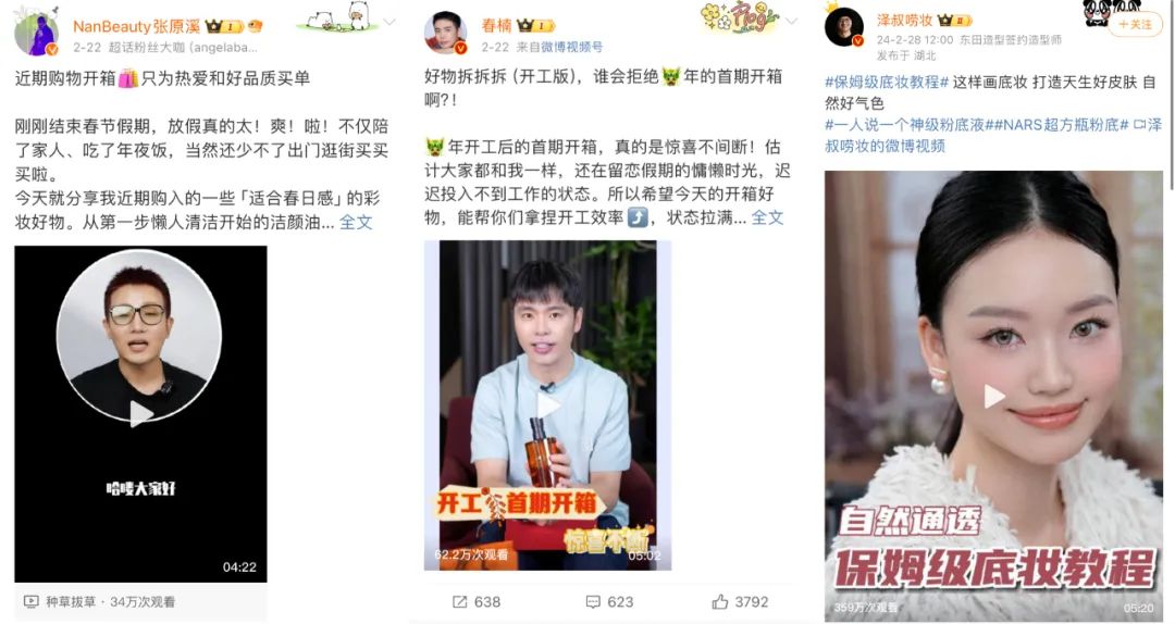 就以今年一季度为例,雅诗兰黛新品白金粉底液发布时,唐毅便携手艺人佟晨洁共同打造了妆教视频,依靠“龙年开运妆”完成对新品种草;植村秀推广琥珀洁颜油时,和明星化妆师春楠、张原溪进行开箱种草合作,流量与互动量均颇为可观;NARS超方瓶与泽叔打造保姆级底妆视频教程,观看量达361万;艾杜纱选择华天崎作为眼彩大师推荐官,对新款睫毛膏卖起了安利……