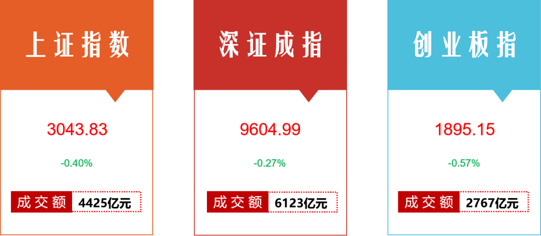 今日收盘,沪指报3043.83点,跌0.40%;深成指报9604.99点,跌0.27%;创业板指报1895.15点,跌0.57%。今日两市成交额10548亿,较上一交易日缩量906亿元,近3000只个股下跌。今日,北上资金净流入35.96亿元、净买入15.67亿元,其中沪股通净流入16.42亿元、净买入6.49亿元;深股通净流入19.54亿元、净买入9.18亿元。沪深两市主力资金净流出235.03亿元,超大单净流出92.98亿元,大单净流出142.06亿元,中单净流出1.04亿元,小单净流入236.07亿元。