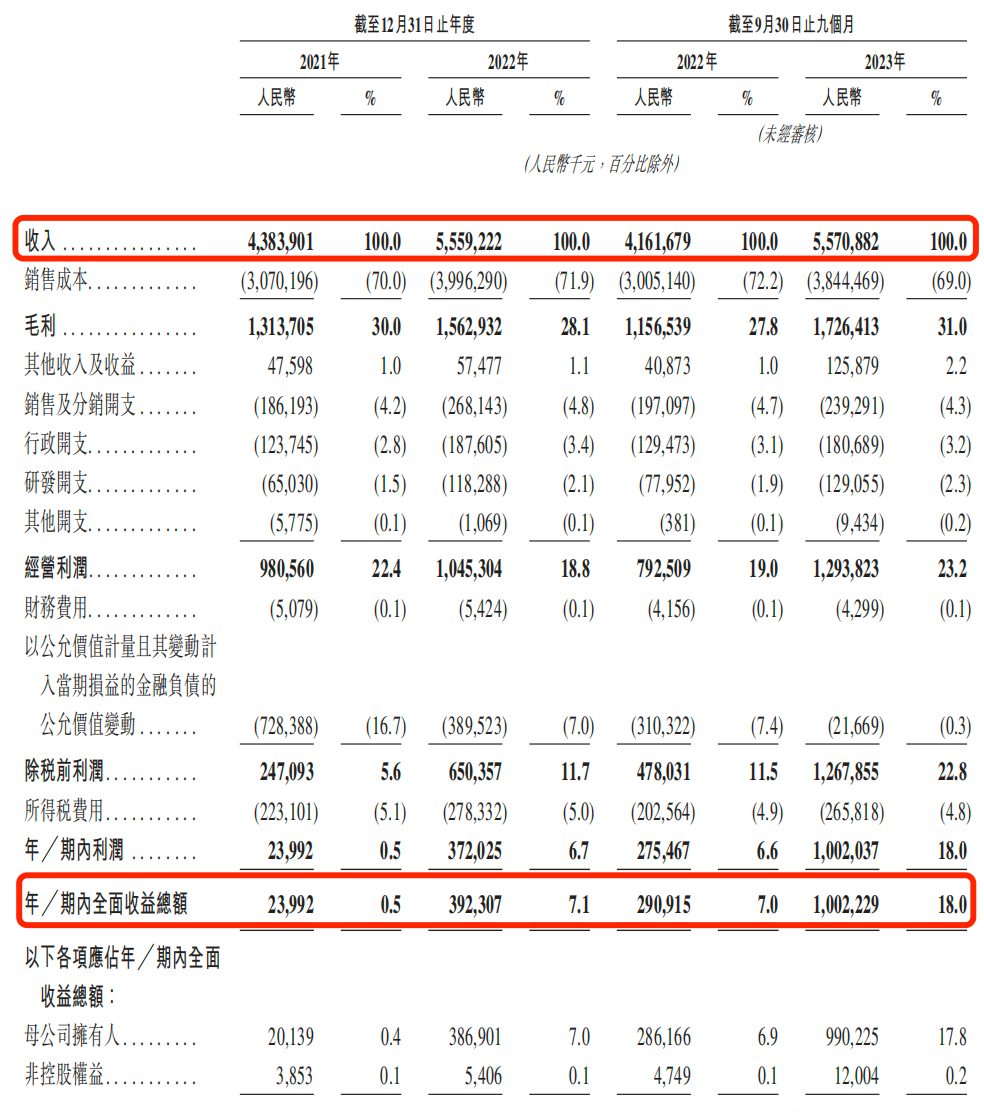 截至2023年底,古茗门店数量达9001家,离“万店俱乐部”仅差一步之遥。古茗赴港IPO招股书显示,2021年、2022年、2023年1-9月营收分别为43.84亿元、55.59亿元、55.71亿元,净利润分别为2399.2万元、3.72亿元、10.02亿元,净利润直接倍数级别增长。