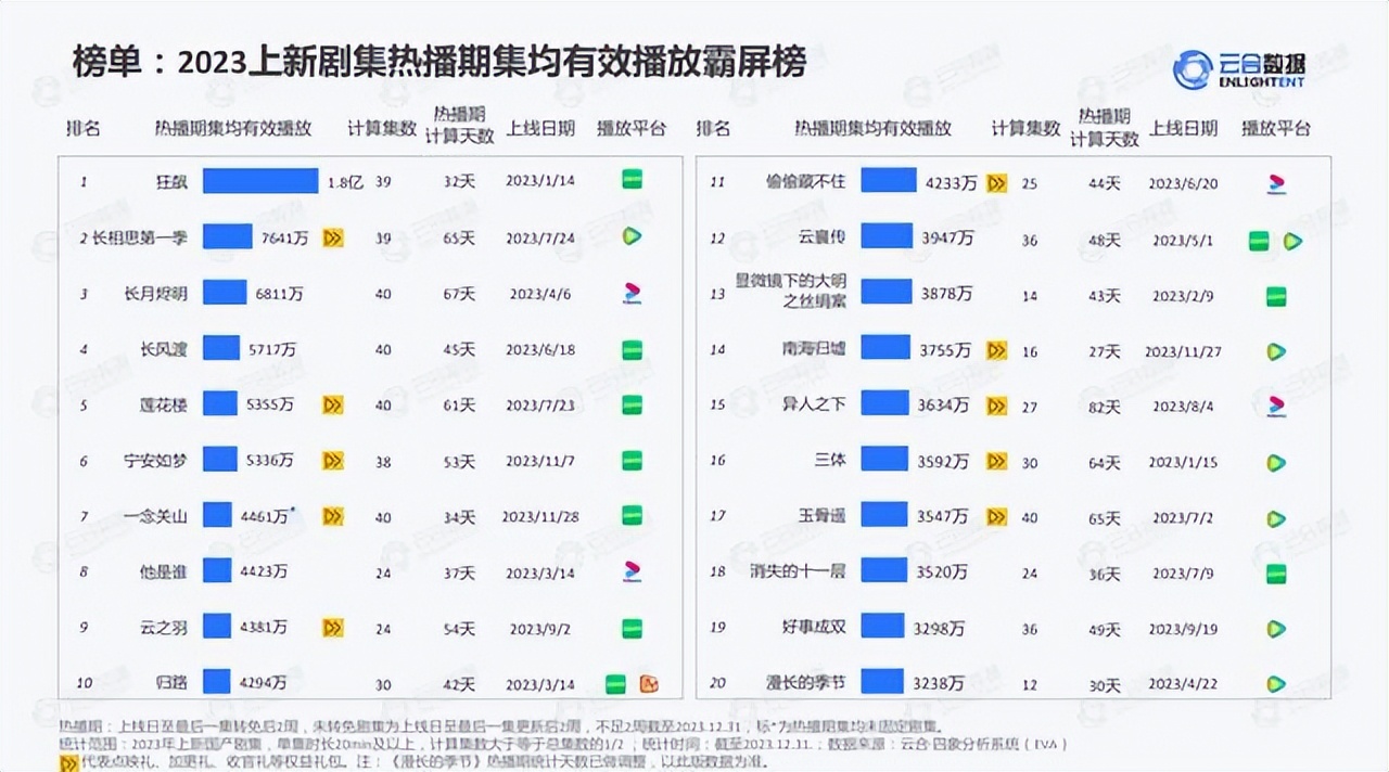 据云合数据显示,2023年,长视频平台共上新国产剧集305部,较2022年减少10部,数量略减的同时,播放效果进一步向头部内容集中,2023全网剧集有效播放TOP10共计322亿,较2022年增长了13.6%,市占率提高了16%。