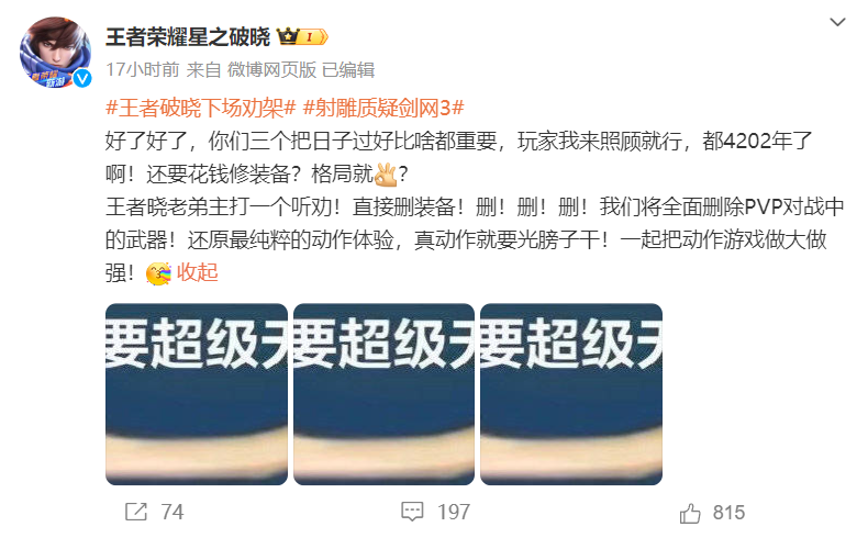就连《王者荣耀星之破晓》也来蹭热度劝架了,官微:你们三个把日子过好比啥都重要,还暗示花钱修装备格局小。