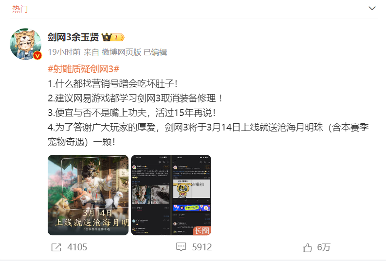 面对网易蹭热度,剑网3制作人回应网易射雕:别什么都找营销号蹭会吃坏肚子!便宜与否不是嘴上功夫、活过15年再说!