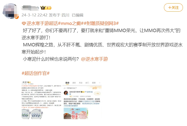 3月12日,网易西山居“打”起来了,腾讯趁机站队。各大MMO游戏纷纷站队或劝架蹭热度,也有不少网友cue《逆水寒》问什么时候加入?