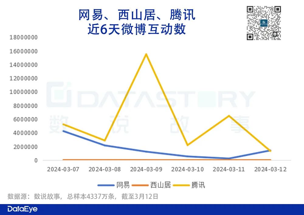 互动量:(赞、转、评、投币、收藏等):截至3月12日,三个公司微博关键词达到了4337万。其中,网易978为万,西山居约2万,腾讯3557万。