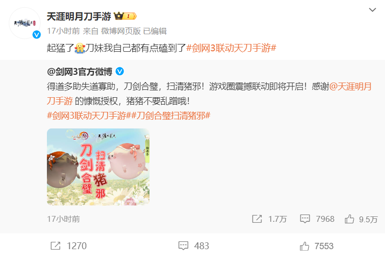 随后《剑网3》宣布联动《天涯明月刀手游》,刀剑合璧,扫清猪邪!(猪字还特意放大加粗)