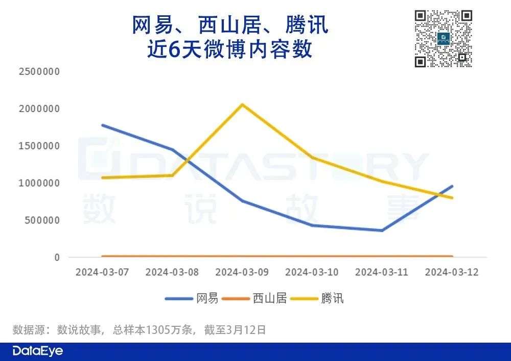 内容条数方面:截至3月12日,国内微博内容条数约为1305万条。其中,网易为569万条,西山居约0.6万条,腾讯735万条。