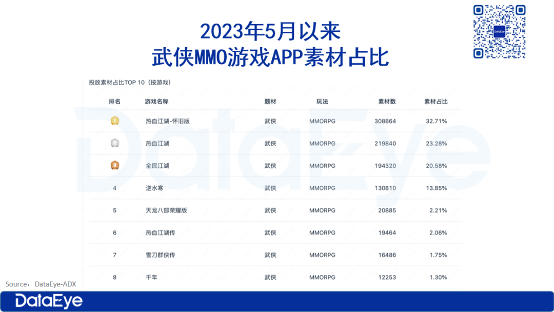2023年5月以来,武侠MMO游戏APP素材占比:四款游戏断崖式领先,行业集中度较高