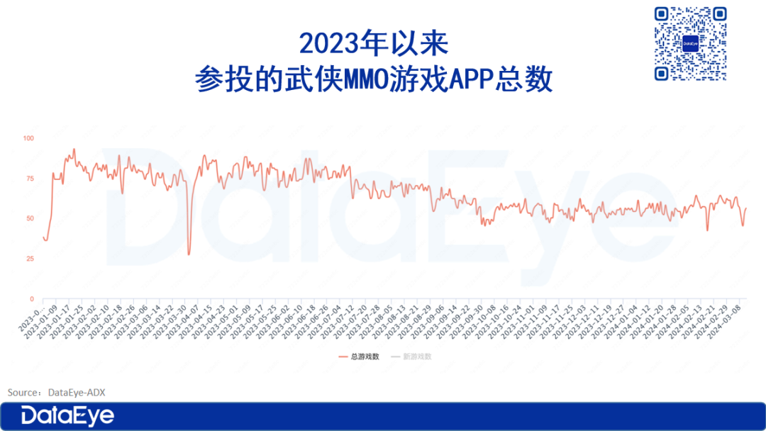 2023年来,参投的武侠MMO游戏APP总数:总体下滑(约20款产品不再参投),去年10月后趋于平稳,目前日均在投60款