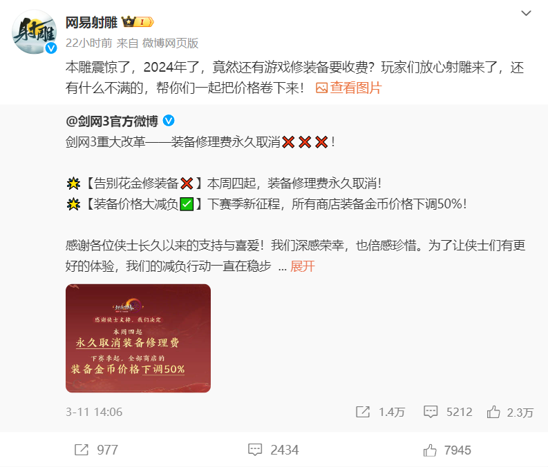 可随后,网易射雕贴脸嘲讽:震惊了,2024年了,还有游戏修装备要收费?放心来射雕......帮你们把价格卷下来。