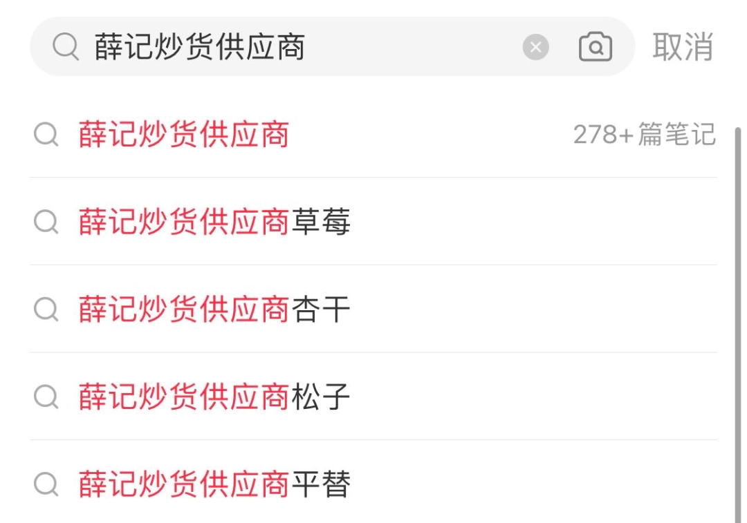 为了以更低的价格吃到相同的美味,消费者自发搜罗薛记炒货的供应商,连“薛记炒货供应商”的关键词下都出现了近300条笔记。
