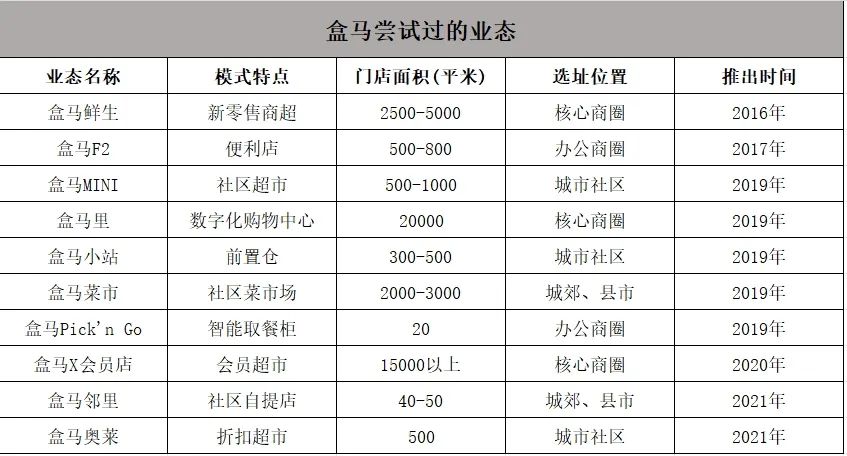但它似乎缺少一些耐心。它已经尝试过近十种业态:盒马F2、盒马mini、盒马邻里、盒马X会员店、盒马奥莱、盒马Premier等,但大部分业务都是打一枪,换一个地方。