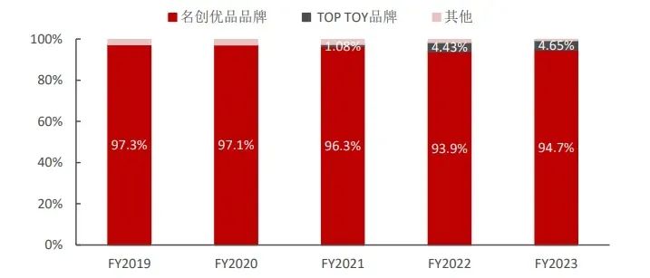 数据显示,2023年四季度TOP TOY营收达1.9亿元,同比增长90%,是同期几大业务板块中增速最快的。TOP TOY的营收从21财年的0.98亿元升至23财年的5.33亿元,占比从1.08%升至 4.65%。