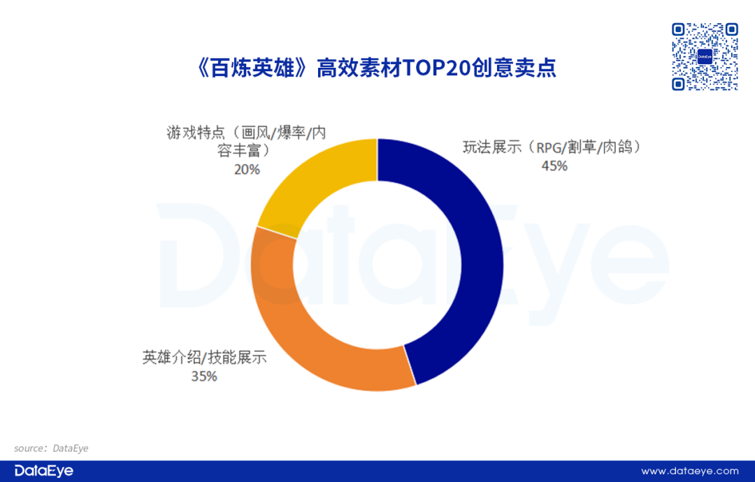游戏实录占比约为35%,相关素材是比较传统的效果广告内容,以展示游戏画面为主。类UGC短片占比较少,官方二创内容相对偏少。素材创意卖点方面,《百炼英雄》的素材主要分为3大块,分别是玩法展示、英雄介绍以及游戏特点介绍。
