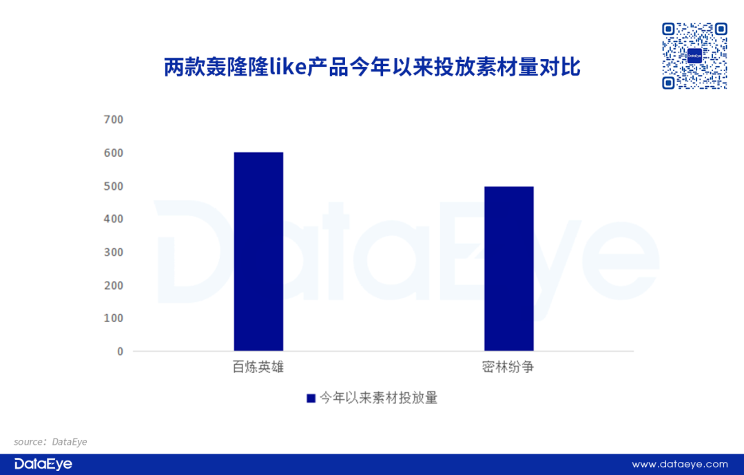 从投放量来看,《百炼英雄》整体素材投放量偏少,但略高于同类型产品《密林纷争》。主要原因可能是目前《百炼英雄》仍在畅销榜前列,并且保持着不俗的市场表现,项目组仍持续投放。