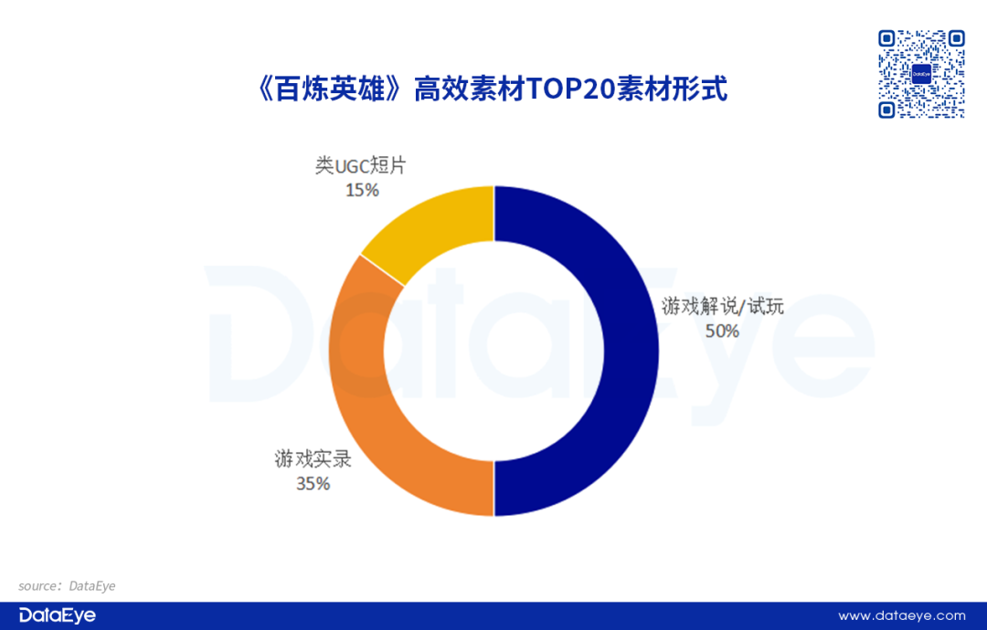 DataEye研究院整理了《百炼英雄》投放计划数TOP20高效素材的创意形式,主要分为3种类型,分别是游戏解说/试玩、游戏实录以及类UGC短片。