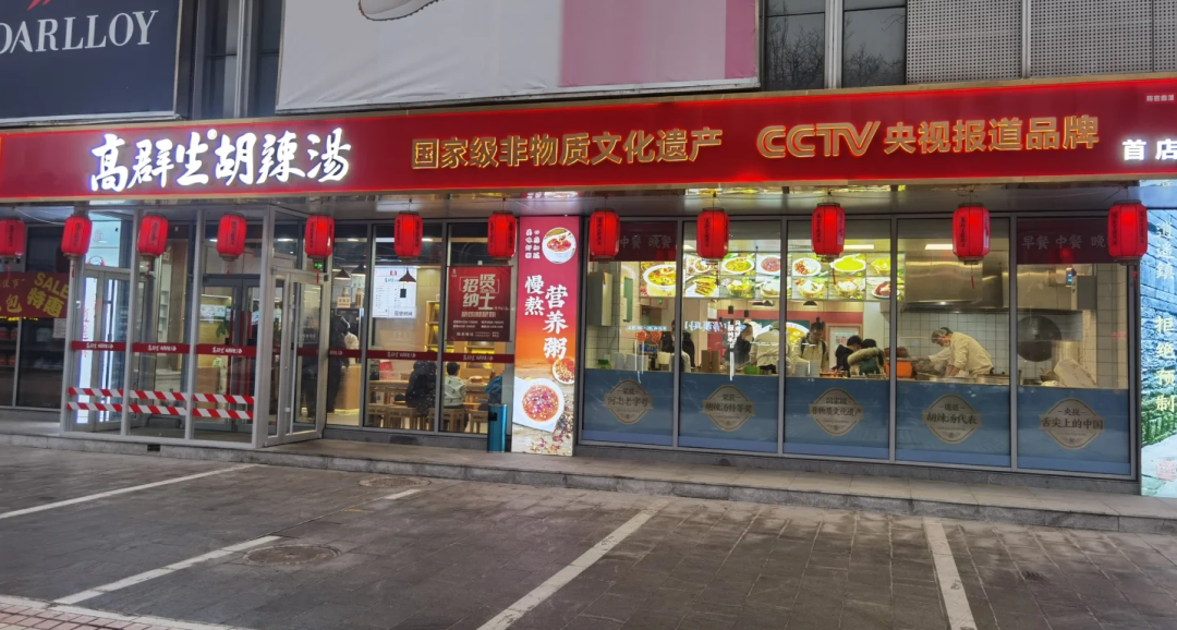 高群生胡辣汤北京首店开在雅宝路天雅大厦一楼,整间门店红白色调为主,辨识度很高。门头上标注的“国家级非物质文化遗产”、“CCTV央视报道品牌”几个大字,也侧面体现出了品牌的分量。