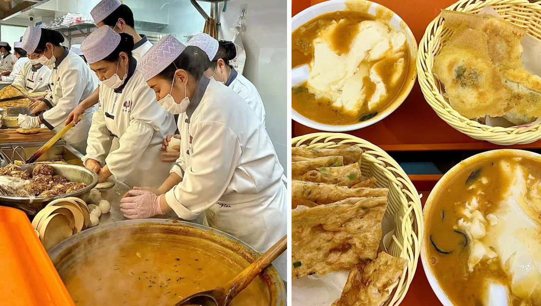 在北京、上海、深圳的门店中,能看到一些颇具胡辣汤仪式感的特色。比如胡辣汤用铁锅盛放、木勺舀出,有种说法是这样更不容易“澥汤”(澥的意思是糊状物、胶状物由稠变稀的过程);门店采用明档,摆放几口大油锅,里面上下翻飞着油条等炸物;食客们一手端着瓷碗,里面是满到快要溢出的汤,一手拿着竹筐,里面放着刚出锅焦香酥脆的油馍。