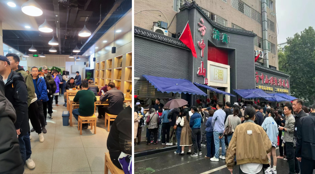 方中山的全国拓张,带动全国多个城市的胡辣汤排队潮。2023年9月,方中山北京首店开业,天还没亮长队已经排出,据说,开业首日排队2小时起步;2023年12月上海首店开业,排队照旧。最夸张的要数南京首店,南京的队伍长到南京人民甚至总结出了多份方中山“排队攻略”。
