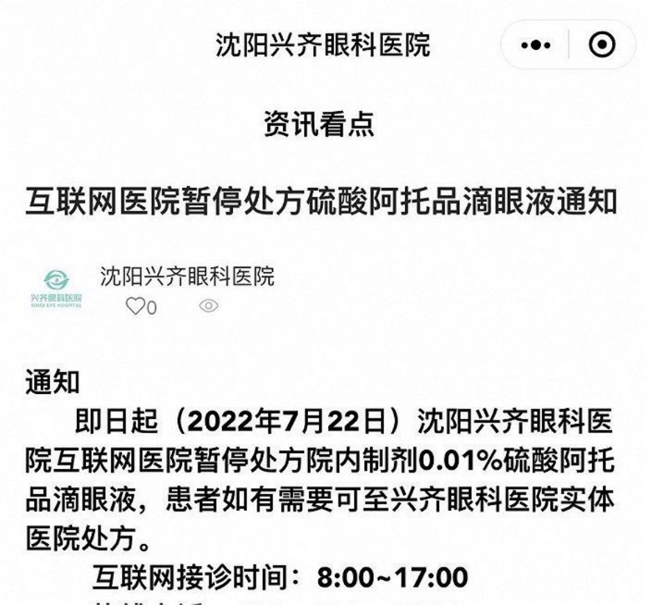 同年12月,沈阳兴齐眼科医院获批互联网医院。通过“院内制剂+互联网医院”的形式实现了该产品的曲线上市销售。没有正式获批,就通过“互联网医院渠道+院内制剂资质”的方式开具阿托品滴眼液,可能存在处方审核不严、扩大使用范围、加大随访观察难度的风险。2022年7月下旬,药监局宣布叫停销售。