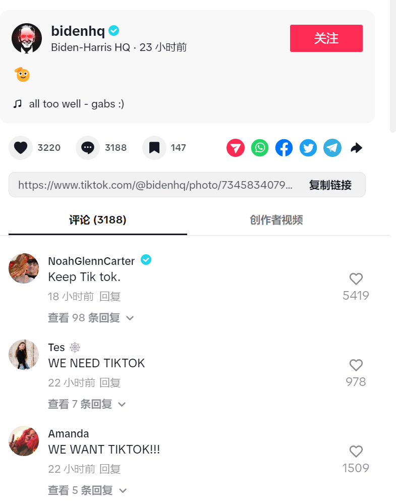 目前,拜登在TikTok最新发布的视频评论区内,充斥着“Keep TikTok”“We need TikTok”等反对剥离法案的声音。