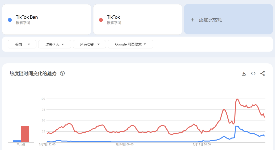 根据Google Trends的热度指数,自3月7日TikTok弹窗至众议院投票前一天,关键词“TikTok Ban”的搜索热度并无显著增长。尽管在3月12日当天,“TikTok Ban”的词条终于上升至热搜第一,但很快热度又再次下降。