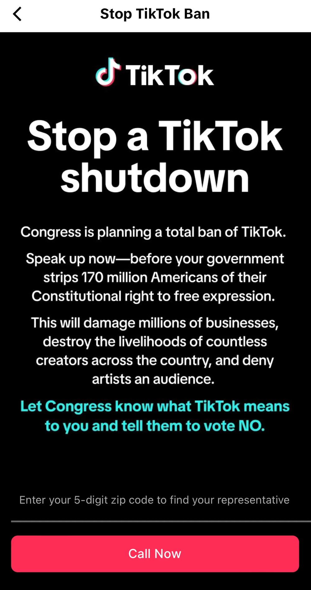 与往年不同的是,面对更迫切的危机,TikTok这次采取了更为直接的反抗方式——弹窗呼吁用户给国会拨打电话。
