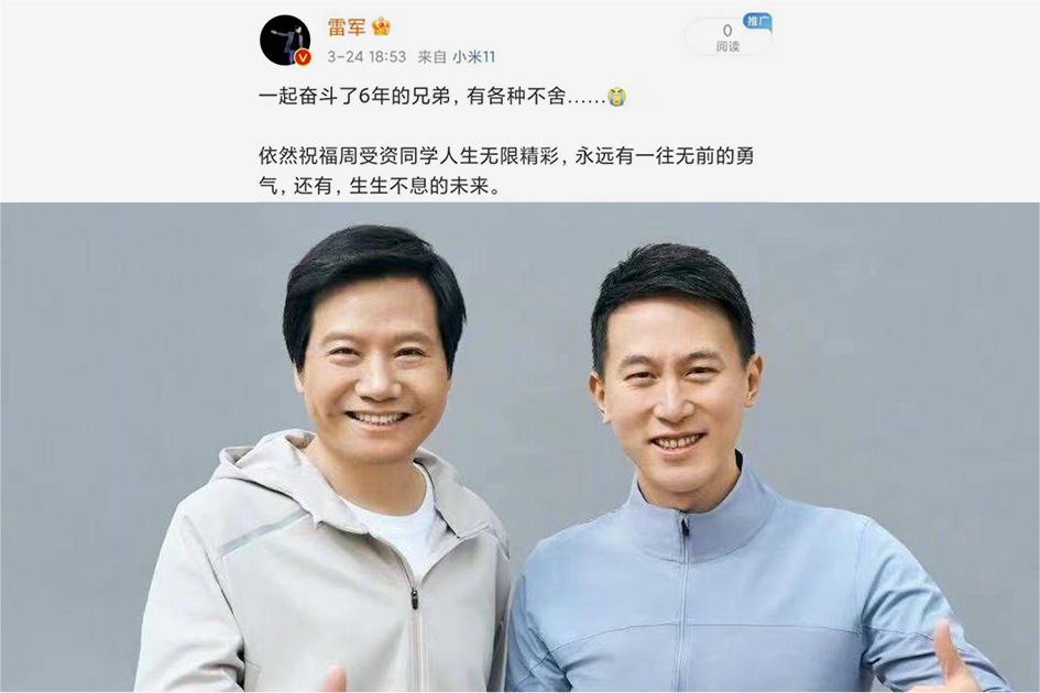 雷军将周受资称为“一起奋斗了6年的兄弟”,他在个人社交媒体发布了一张两人的合影,并写道:尽管有各种不舍,依然祝福周受资同学人生无限精彩。