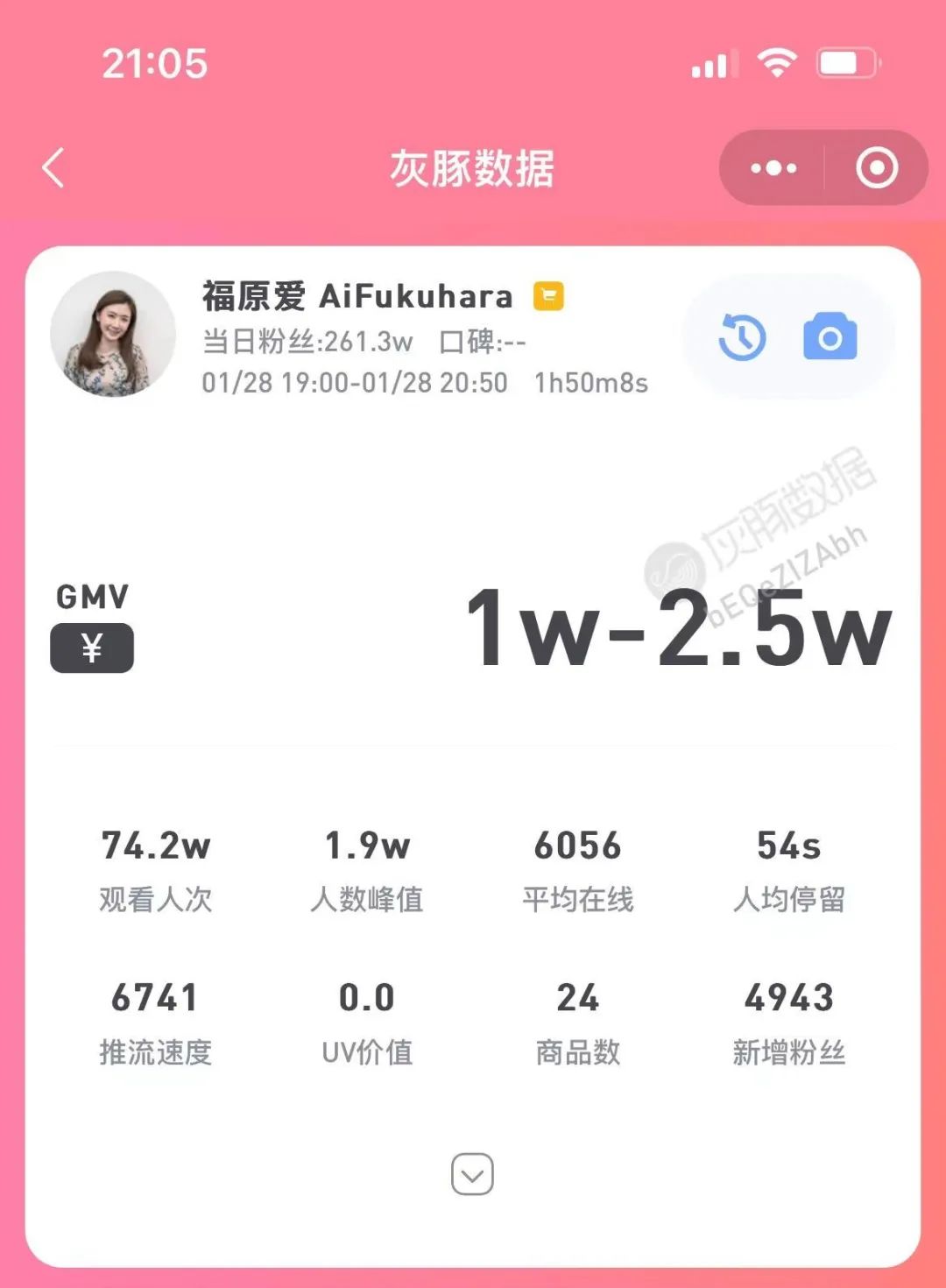 今年一月,知名乒乓球运动员福原爱开启直播直播首秀,在场观人次超过140万的情况下,最终带货数量2375件,总GMV仅为2.3万元,客单价甚至不到10元。