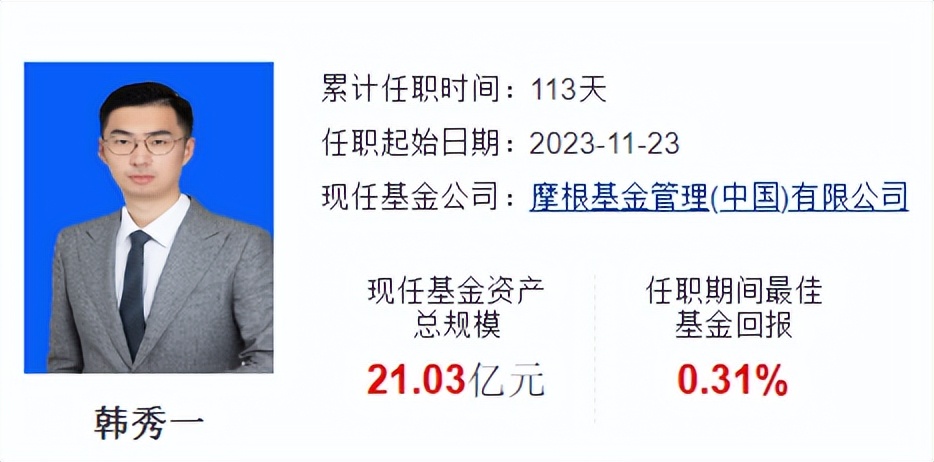 与钱晶相比,摩根中证A50ETF基金经理韩秀一则是圈内嫩鸟。公开信息显示,韩秀一担任基金经理的时间仅113天。其在管规模21.03亿,任职最佳回报0.31%,在管基金4只,其中包括摩根平安中证A50ETF,其余3只基金规模都很小,且与其他人共管。